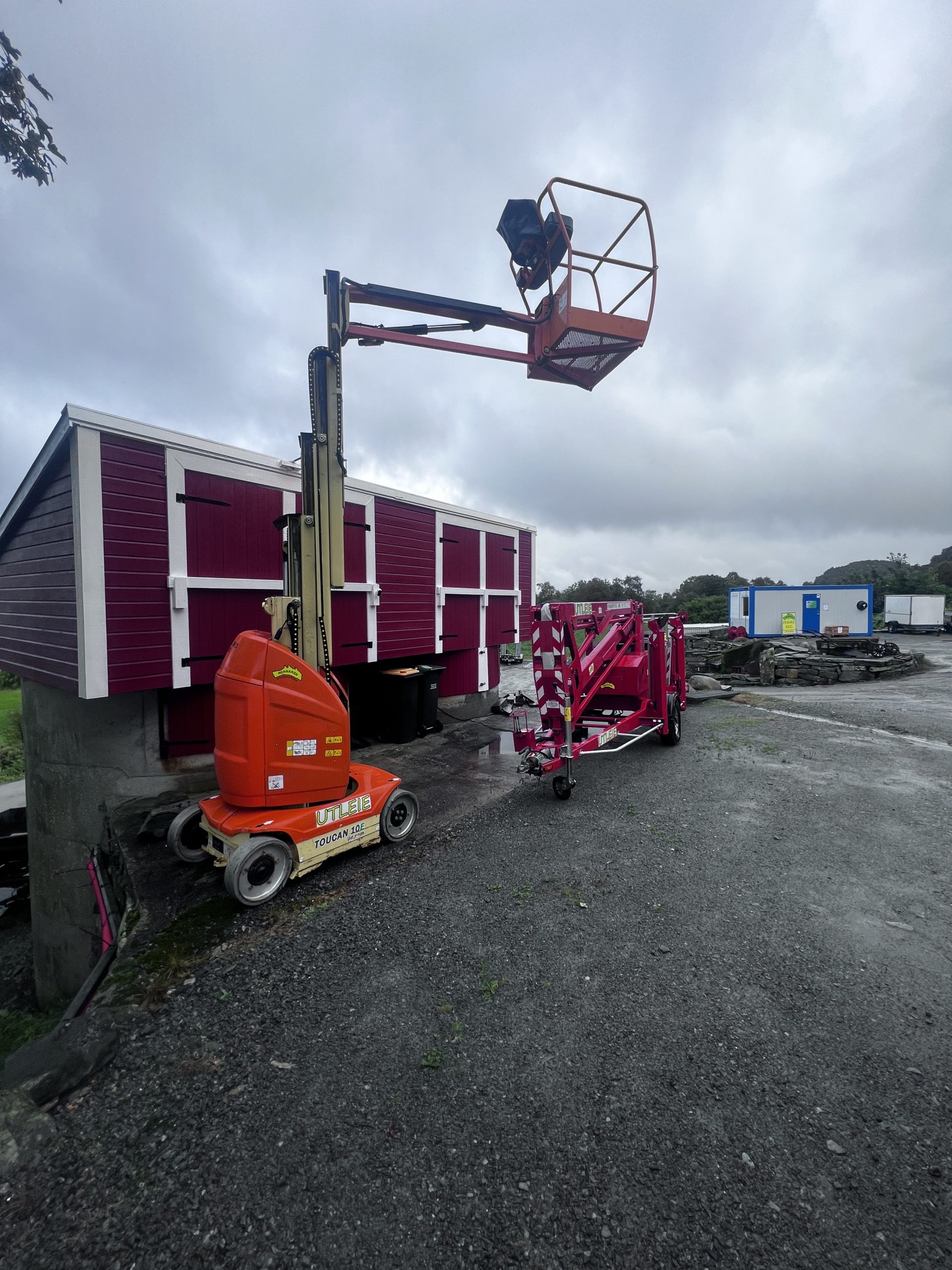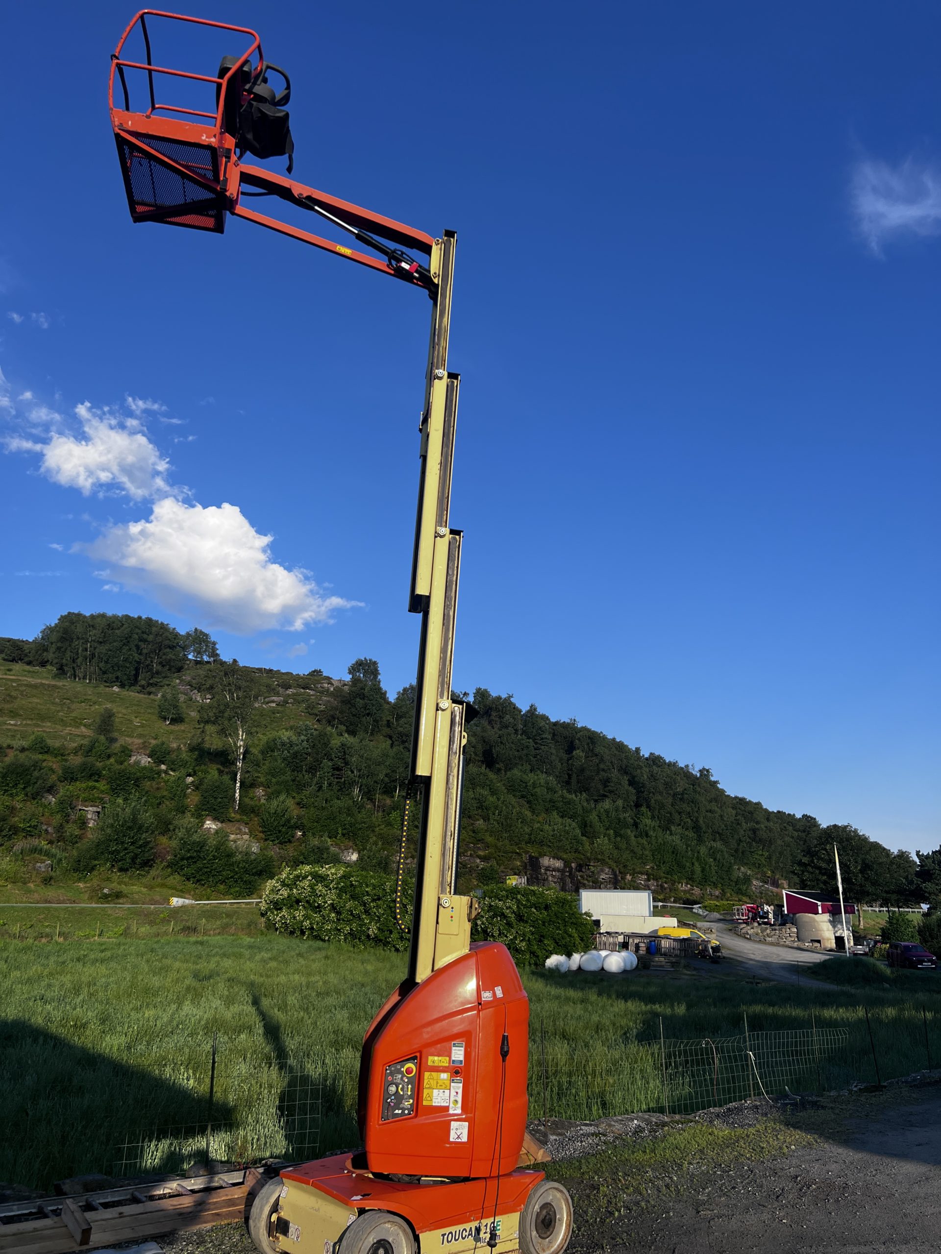 Bomliften10m kan hentes hos oss på Rennaren, den veier 3500kg inkl. lånehenger og kan trekkes med vanlig bil.